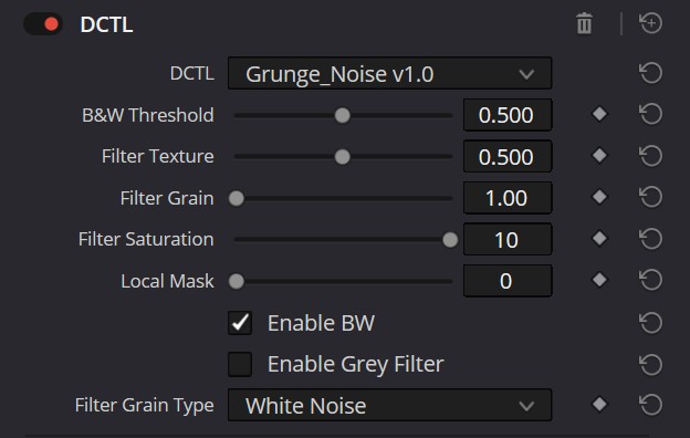 - Nodo 2 (Grunge Noise DCTL): Realiza la transformación estética principal.